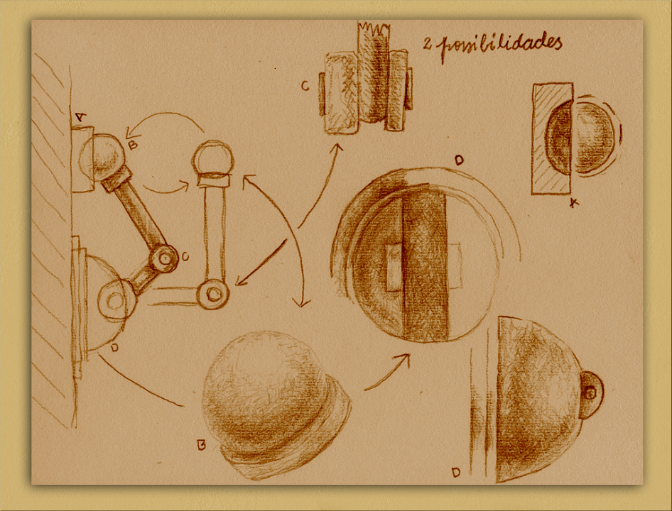 Desenho e esquema de funcionamento do manípulo que controla os quatro puzzles do game. As várias visualizações desenhadas mostram sua estrutura e o indicam o seu funcionamento mecânico.